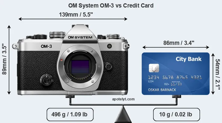The physical dimensions of the OM System OM-3 relative to a credit card are illustrated in the side-by-side display below. Three consecutive perspectives from the front, the top, and the back are presented. All width, height and depth measures are rounded to the nearest millimeter.