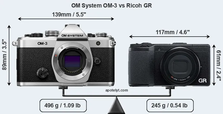 An illustration of the physical size and weight of the OM System OM-3 and the Ricoh GR is provided in the side-by-side display below. The two cameras are presented according to their relative size. Three successive views from the front, the top, and the rear are shown. All width, height and depth dimensions are rounded to the nearest millimeter.
