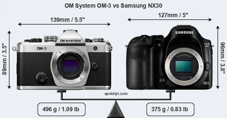 An illustration of the physical size and weight of the OM System OM-3 and the Samsung NX30 is provided in the side-by-side display below. The two cameras are presented according to their relative size. Three successive views from the front, the top, and the rear are shown. All width, height and depth measures are rounded to the nearest millimeter.