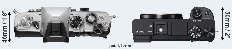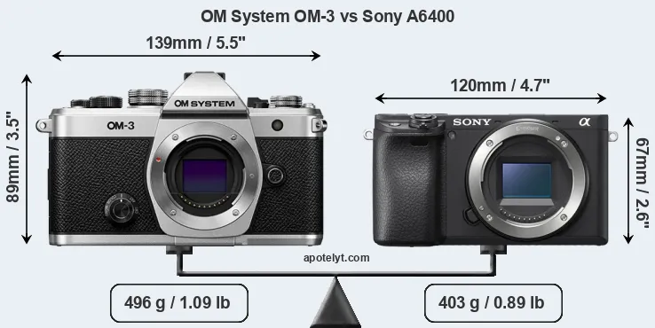 An illustration of the physical size and weight of the OM System OM-3 and the Sony A6400 is provided in the side-by-side display below. The two cameras are presented according to their relative size. Three successive views from the front, the top, and the rear are shown. All width, height and depth measures are rounded to the nearest millimeter.