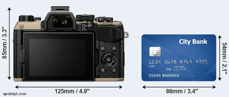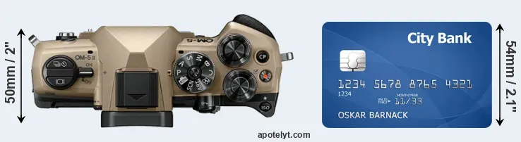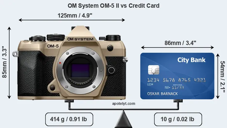 The side-by-side display below illustrates the physical size of the OM System OM-5 II vis-à-vis a credit card. Three successive views from the front, the top, and the rear are shown. All width, height and depth dimensions are rounded to the nearest millimeter.