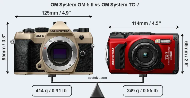 The OM System OM-5 II and the OM System Tough TG-7 are two digital cameras that were announced, respectively, in June 2025 and September 2023. The OM-5 II is a mirrorless interchangeable lens camera, while the TG-7 is a fixed lens compact. The cameras are based on a Four Thirds (OM-5 II) and a 1/2.3-inch (TG-7) sensor. The OM-5 II has a resolution of 20.2 megapixels, whereas the TG-7 provides 12 MP.