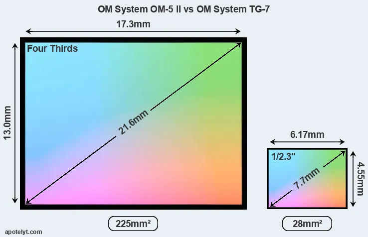 Of the two cameras under consideration, the OM System OM-5 II features a Four Thirds sensor and the OM System TG-7 a 1/2.3-inch sensor. The sensor area in the TG-7 is 88 percent smaller. As a result of these sensor size differences, the cameras have a format factor of, respectively, 2.0 and 5.6. Both cameras feature a native aspect ratio (sensor width to sensor height) of 4:3.
