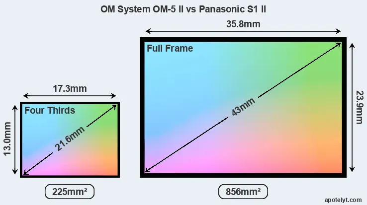 Of the two cameras under consideration, the OM System OM-5 II features a Four Thirds sensor and the Panasonic S1 II a full frame sensor. The sensor area in the S1 II is 280 percent bigger. As a result of these sensor size differences, the cameras have a format factor of, respectively, 2.0 and 1.0. The sensor in the OM-5 II has a native 4:3 aspect ratio, while the one in the S1 II offers a 3:2 aspect.