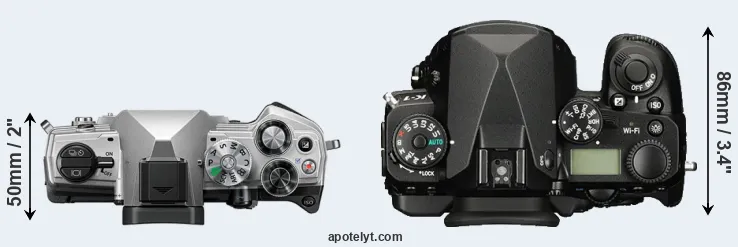 An illustration of the physical size and weight of the OM System OM-5 and the Pentax K-1 is provided in the side-by-side display below. The two cameras are presented according to their relative size. Three consecutive perspectives from the front, the top, and the back are available. All size dimensions are rounded to the nearest millimeter.