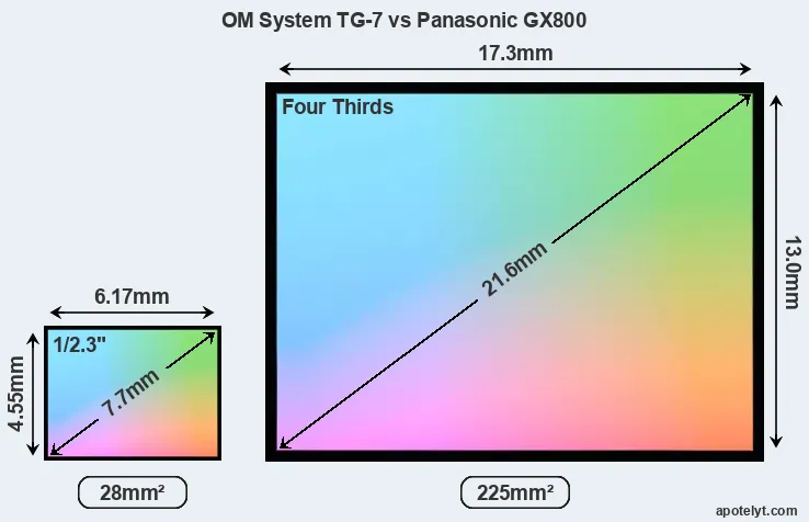 Of the two cameras under consideration, the OM System TG-7 features a 1/2.3-inch sensor and the Panasonic GX800 a Four Thirds sensor. The sensor area in the GX800 is 704 percent bigger. As a result of these sensor size differences, the cameras have a format factor of, respectively, 5.6 and 2.0. Both cameras feature a native aspect ratio (sensor width to sensor height) of 4:3.