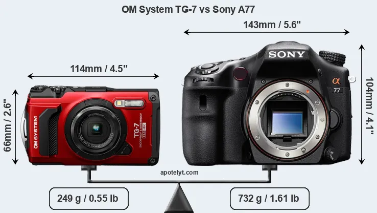 The above size and weight comparisons are to some extent incomplete and possibly misleading, as the TG-7 has a lens built in, whereas the A77 is an interchangeable lens camera that requires a separate lens. Attaching the latter will add extra weight and bulk to the setup.