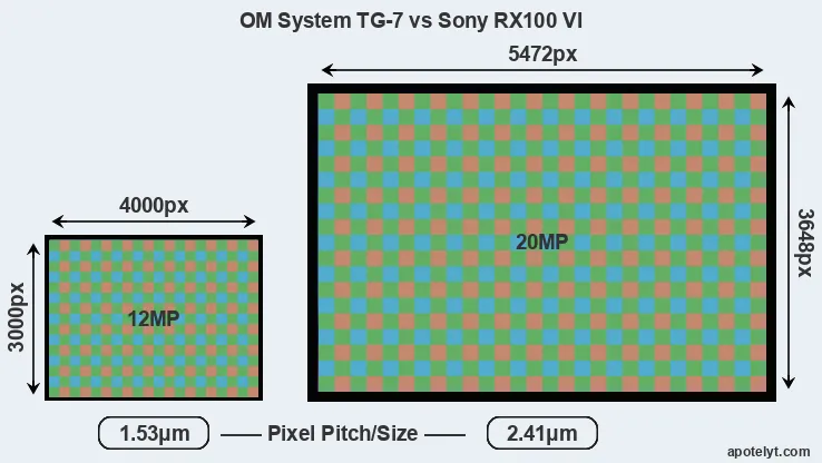 With 20MP, the RX100 VI offers a higher resolution than the TG-7 (12MP), but the RX100 VI nevertheless has larger individual pixels (pixel pitch of 2.41μm versus 1.53μm for the TG-7) due to its larger sensor. However, the TG-7 is a much more recent model (by 5 years and 3 months) than the RX100 VI, and its sensor will have benefitted from technological advances during this time that enhance the light gathering capacity of its pixel-units.