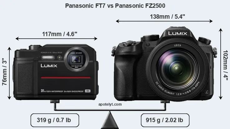 If the front view area (width x height) of the cameras is taken as an aggregate measure of their size, the Panasonic FZ2500 is considerably larger (58 percent) than the Panasonic FT7. Moreover, the FZ2500 is substantially heavier (187 percent) than the FT7. It is worth mentioning in this context that the FT7 is splash and dust resistant, while the FZ2500 does not feature any corresponding weather-sealing. More than that, the FT7 is water-proof up to 31m and can, thus, be used for underwater photography.