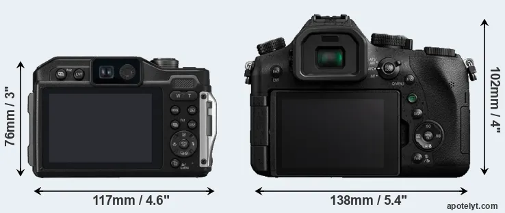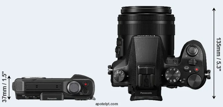 The side-by-side display below illustrates the physical size and weight of the Panasonic FT7 and the Panasonic FZ2500. The two cameras are presented according to their relative size. Three successive views from the front, the top, and the rear are shown. All size dimensions are rounded to the nearest millimeter.
