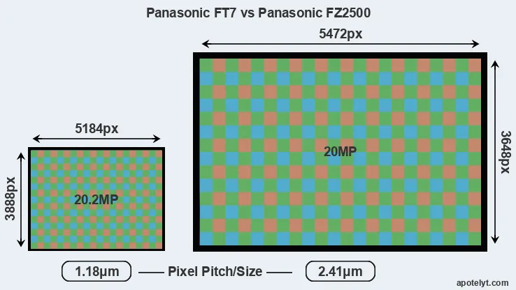 Despite having a smaller sensor, the Panasonic FT7 offers a higher resolution of 20.2 megapixels, compared with 20 MP of the Panasonic FZ2500. This megapixels advantage comes at the cost of a higher pixel density and a smaller size of the individual pixel (with a pixel pitch of 1.18μm versus 2.41μm for the FZ2500). However, it should be noted that the FT7 is a somewhat more recent model (by 1 year and 7 months) than the FZ2500, and its sensor might have benefitted from technological advances during this time that partly offset its pixel-size disadvantage.