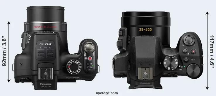 An illustration of the physical size and weight of the Panasonic FZ150 and the Panasonic FZ300 is provided in the side-by-side display below. The two cameras are presented according to their relative size. Three consecutive perspectives from the front, the top, and the back are available. All size dimensions are rounded to the nearest millimeter.