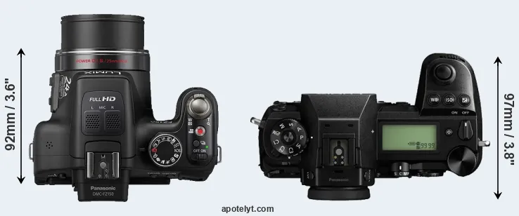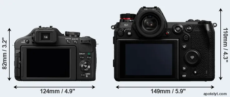 The side-by-side display below illustrates the physical size and weight of the Panasonic FZ150 and the Panasonic S1. The two cameras are presented according to their relative size. Three consecutive perspectives from the front, the top, and the back are available. All width, height and depth measures are rounded to the nearest millimeter.