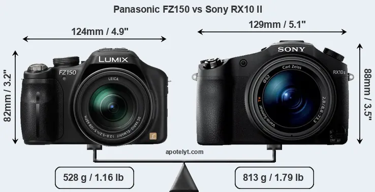 An illustration of the physical size and weight of the Panasonic FZ150 and the Sony RX10 II is provided in the side-by-side display below. The two cameras are presented according to their relative size. Three consecutive perspectives from the front, the top, and the back are available. All size dimensions are rounded to the nearest millimeter.