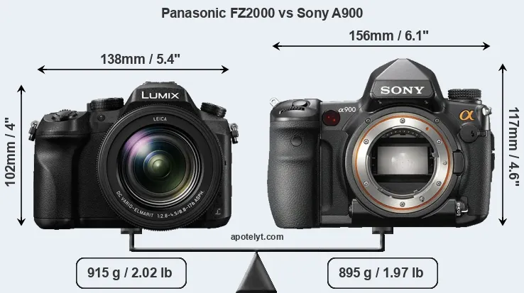 An illustration of the physical size and weight of the Panasonic FZ2000 and the Sony A900 is provided in the side-by-side display below. The two cameras are presented according to their relative size. Three consecutive perspectives from the front, the top, and the back are available. All size dimensions are rounded to the nearest millimeter.