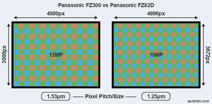 While the two cameras under review share the same sensor size, the FZ82D offers a higher resolution of 18 megapixels, compared with 12 MP of the FZ300. This megapixels advantage translates into a 22 percent gain in linear resolution. On the other hand, these sensor specs imply that the FZ82D has a higher pixel density and a smaller size of the individual pixel (with a pixel pitch of 1.25μm versus 1.53μm for the FZ300). However, it should be noted that the FZ82D is much more recent (by 8 years and 11 months) than the FZ300, and its sensor will have benefitted from technological advances during this time that compensate for the smaller pixel size. Coming back to sensor resolution, it should be mentioned that neither of the two cameras has an anti-alias filter installed, so they are able to capture all the detail the sensor resolves.