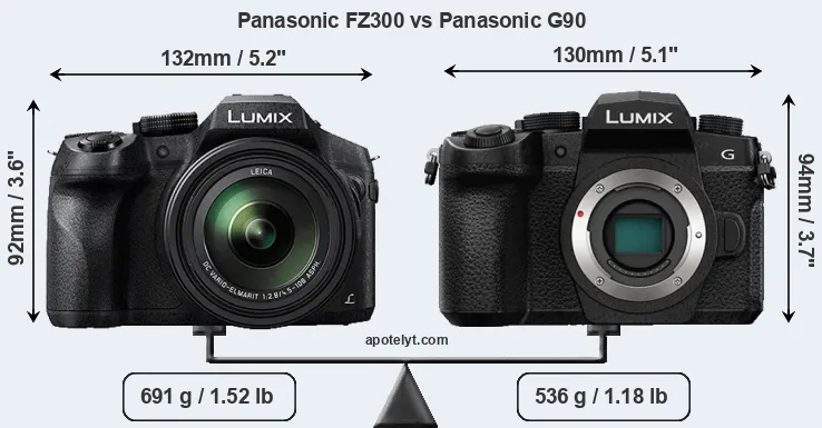 The physical size and weight of the Panasonic FZ300 and the Panasonic G90 are illustrated in the side-by-side display below. The two cameras are presented according to their relative size. Three consecutive perspectives from the front, the top, and the back are available. All width, height and depth dimensions are rounded to the nearest millimeter.
