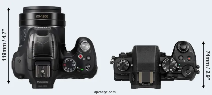 The physical size and weight of the Panasonic FZ80D and the Panasonic G85 are illustrated in the side-by-side display below. The two cameras are presented according to their relative size. Three consecutive perspectives from the front, the top, and the back are available. All width, height and depth dimensions are rounded to the nearest millimeter.