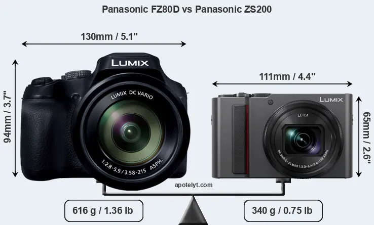 If the front view area (width x height) of the cameras is taken as an aggregate measure of their size, the Panasonic ZS200 is considerably smaller (41 percent) than the Panasonic FZ80D. Moreover, the ZS200 is substantially lighter (45 percent) than the FZ80D. In this context, it is worth noting that neither the FZ80D nor the ZS200 are weather-sealed.