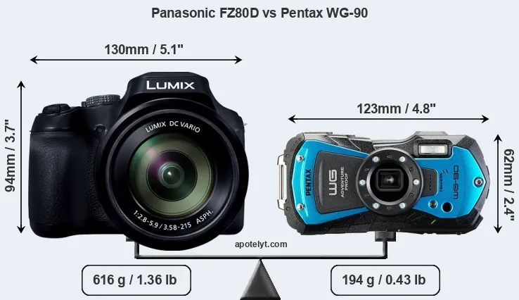 The physical size and weight of the Panasonic FZ80D and the Pentax WG-90 are illustrated in the side-by-side display below. The two cameras are presented according to their relative size. Three successive views from the front, the top, and the rear are shown. All width, height and depth measures are rounded to the nearest millimeter.
