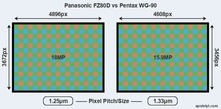 While the two cameras under review share the same sensor size, the FZ80D offers a higher resolution of 18 megapixels, compared with 15.9 MP of the WG-90. This megapixels advantage translates into a 6 percent gain in linear resolution. On the other hand, these sensor specs imply that the FZ80D has a higher pixel density and a smaller size of the individual pixel (with a pixel pitch of 1.25μm versus 1.33μm for the WG-90). In this context, it should be noted, however, that the FZ80D is a somewhat more recent model (by 7 months) than the WG-90, and its sensor might have benefitted from technological advances during this time that at least partly compensate for the smaller pixel size. Coming back to sensor resolution, it should be mentioned that neither of the two cameras has an anti-alias filter installed, so they are able to capture all the detail the sensor resolves.