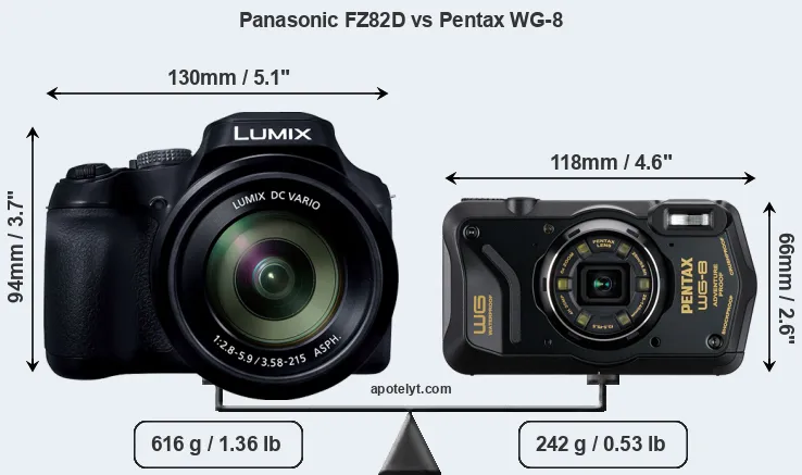 The side-by-side display below illustrates the physical size and weight of the Panasonic FZ82D and the Pentax WG-8. The two cameras are presented according to their relative size. Three consecutive views from the front, the top, and the rear side are shown. All size dimensions are rounded to the nearest millimeter.