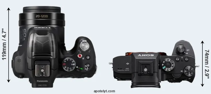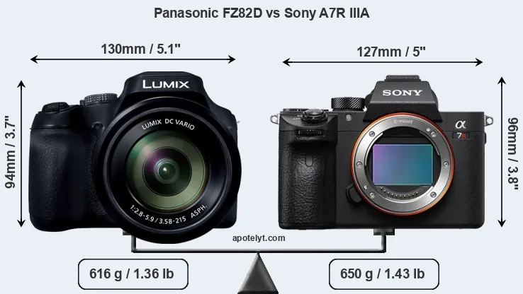 The physical size and weight of the Panasonic FZ82D and the Sony A7R IIIA are illustrated in the side-by-side display below. The two cameras are presented according to their relative size. Three consecutive perspectives from the front, the top, and the back are available. All width, height and depth dimensions are rounded to the nearest millimeter.