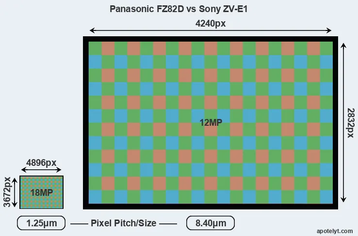 Despite having a smaller sensor, the Panasonic FZ82D offers a higher resolution of 18 megapixels, compared with 12 MP of the Sony ZV-E1. This megapixels advantage comes at the cost of a higher pixel density and a smaller size of the individual pixel (with a pixel pitch of 1.25μm versus 8.40μm for the ZV-E1). However, it should be noted that the FZ82D is a somewhat more recent model (by 1 year and 3 months) than the ZV-E1, and its sensor might have benefitted from technological advances during this time that partly offset its pixel-size disadvantage. Coming back to sensor resolution, it should be mentioned that the FZ82D has no anti-alias filter installed, so that it can capture all the detail its sensor resolves.