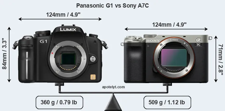 If the front view area (width x height) of the cameras is taken as an aggregate measure of their size, the Sony A7C is notably smaller (15 percent) than the Panasonic G1. However, the A7C is substantially heavier (41 percent) than the G1. It is noteworthy in this context that the A7C is splash and dust-proof, while the G1 does not feature any corresponding weather-sealing.