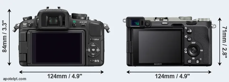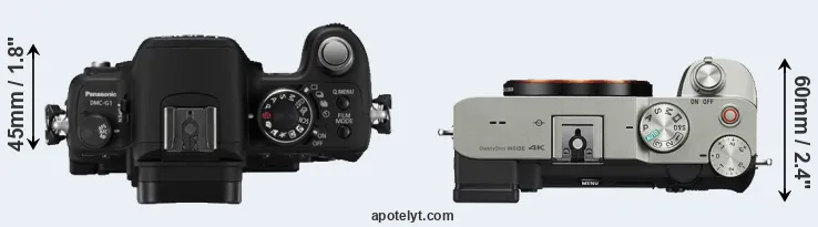 The side-by-side display below illustrates the physical size and weight of the Panasonic G1 and the Sony A7C. The two cameras are presented according to their relative size. Three successive views from the front, the top, and the rear are shown. All width, height and depth measures are rounded to the nearest millimeter.