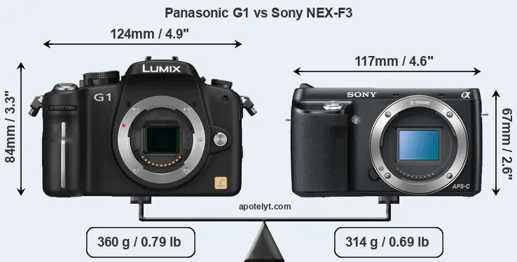 The physical size and weight of the Panasonic G1 and the Sony NEX-F3 are illustrated in the side-by-side display below. The two cameras are presented according to their relative size. Three consecutive perspectives from the front, the top, and the back are available. All width, height and depth dimensions are rounded to the nearest millimeter.