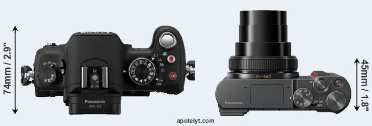 If the front view area (width x height) of the cameras is taken as an aggregate measure of their size, the Panasonic TZ200 is considerably smaller (31 percent) than the Panasonic G2. In this context, it is worth noting that neither the G2 nor the TZ200 are weather-sealed.