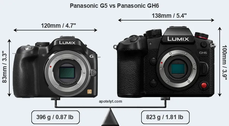 If the front view area (width x height) of the cameras is taken as an aggregate measure of their size, the Panasonic GH6 is notably larger (39 percent) than the Panasonic G5. Moreover, the GH6 is substantially heavier (108 percent) than the G5. It is noteworthy in this context that the GH6 is splash and dust-proof, while the G5 does not feature any corresponding weather-sealing.