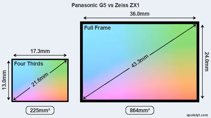 Of the two cameras under consideration, the Panasonic G5 features a Four Thirds sensor and the Zeiss ZX1 a full frame sensor. The sensor area in the ZX1 is 284 percent bigger. As a result of these sensor size differences, the cameras have a format factor of, respectively, 2.0 and 1.0. The sensor in the G5 has a native 4:3 aspect ratio, while the one in the ZX1 offers a 3:2 aspect.