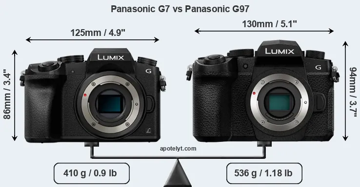 If the front view area (width x height) of the cameras is taken as an aggregate measure of their size, the Panasonic G97 is notably larger (14 percent) than the Panasonic G7. Moreover, the G97 is markedly heavier (31 percent) than the G7. It is noteworthy in this context that the G97 is splash and dust-proof, while the G7 does not feature any corresponding weather-sealing.