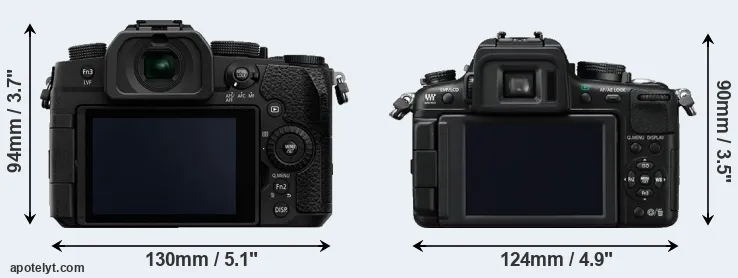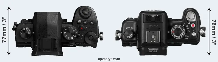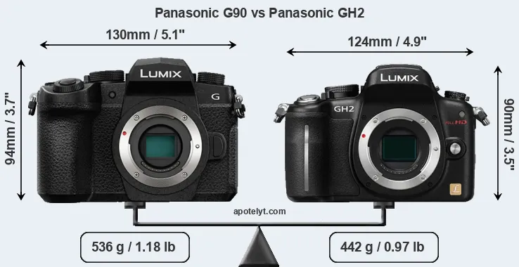 The side-by-side display below illustrates the physical size and weight of the Panasonic G90 and the Panasonic GH2. The two cameras are presented according to their relative size. Three consecutive perspectives from the front, the top, and the back are available. All width, height and depth dimensions are rounded to the nearest millimeter.