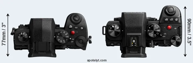 The side-by-side display below illustrates the physical size and weight of the Panasonic G97 and the Panasonic S5 II. The two cameras are presented according to their relative size. Three consecutive perspectives from the front, the top, and the back are available. All size dimensions are rounded to the nearest millimeter.