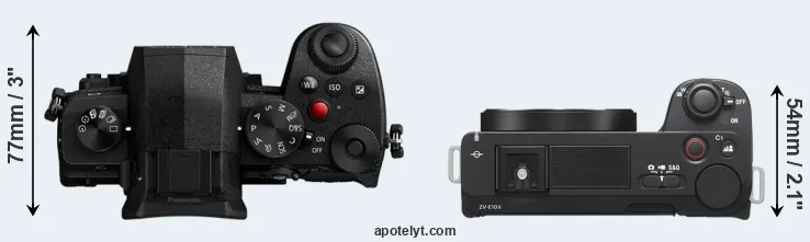 The side-by-side display below illustrates the physical size and weight of the Panasonic G97 and the Sony ZV-E10 II. The two cameras are presented according to their relative size. Three consecutive views from the front, the top, and the rear side are shown. All width, height and depth measures are rounded to the nearest millimeter.