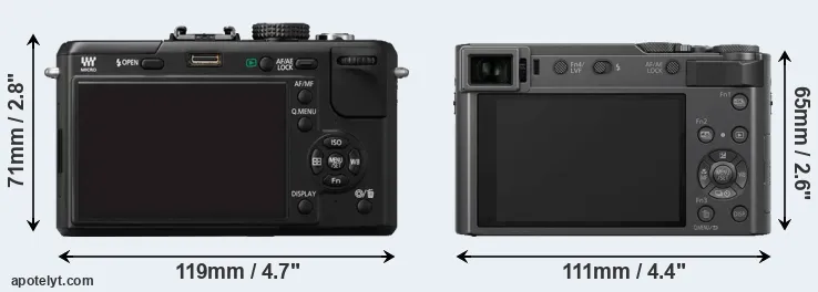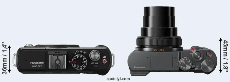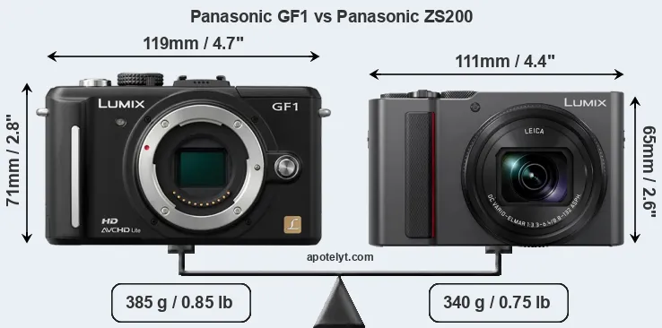 The side-by-side display below illustrates the physical size and weight of the Panasonic GF1 and the Panasonic ZS200. The two cameras are presented according to their relative size. Three consecutive perspectives from the front, the top, and the back are available. All width, height and depth measures are rounded to the nearest millimeter.