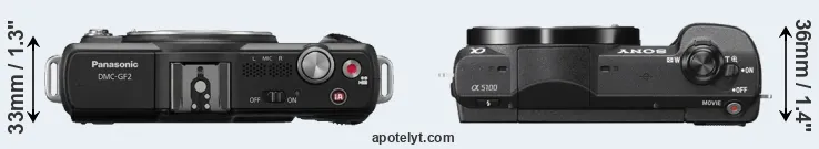 An illustration of the physical size and weight of the Panasonic GF2 and the Sony A5100 is provided in the side-by-side display below. The two cameras are presented according to their relative size. Three consecutive views from the front, the top, and the rear side are shown. All width, height and depth measures are rounded to the nearest millimeter.