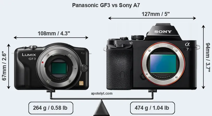 If the front view area (width x height) of the cameras is taken as an aggregate measure of their size, the Sony A7 is considerably larger (65 percent) than the Panasonic GF3. Moreover, the A7 is substantially heavier (80 percent) than the GF3. It is noteworthy in this context that the A7 is splash and dust-proof, while the GF3 does not feature any corresponding weather-sealing.