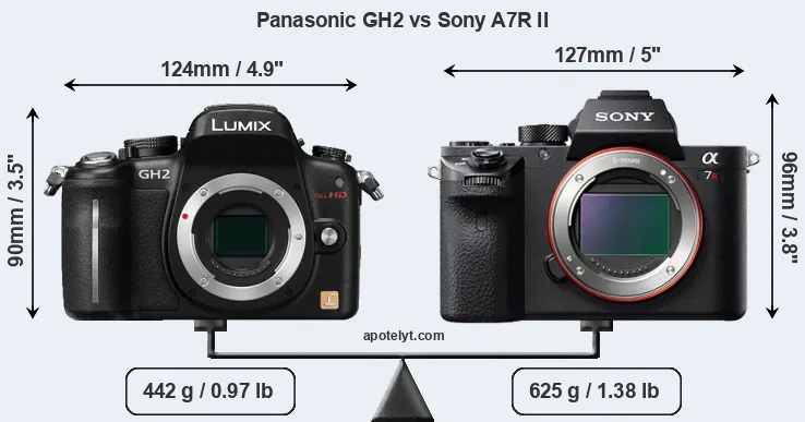 An illustration of the physical size and weight of the Panasonic GH2 and the Sony A7R II is provided in the side-by-side display below. The two cameras are presented according to their relative size. Three consecutive perspectives from the front, the top, and the back are available. All size dimensions are rounded to the nearest millimeter.