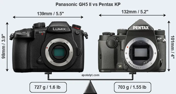 An illustration of the physical size and weight of the Panasonic GH5 II and the Pentax KP is provided in the side-by-side display below. The two cameras are presented according to their relative size. Three consecutive perspectives from the front, the top, and the back are available. All width, height and depth dimensions are rounded to the nearest millimeter.