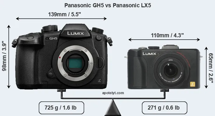 An illustration of the physical size and weight of the Panasonic GH5 and the Panasonic LX5 is provided in the side-by-side display below. The two cameras are presented according to their relative size. Three successive views from the front, the top, and the rear are shown. All width, height and depth dimensions are rounded to the nearest millimeter.