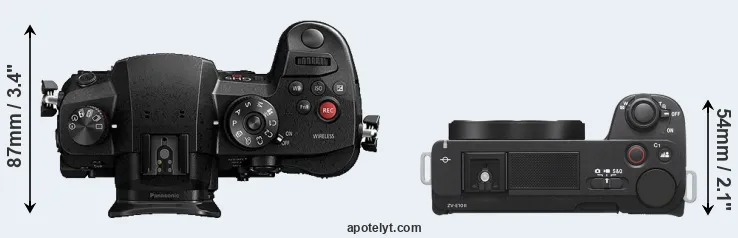 The physical size and weight of the Panasonic GH5s and the Sony ZV-E10 II are illustrated in the side-by-side display below. The two cameras are presented according to their relative size. Three consecutive views from the front, the top, and the rear side are shown. All width, height and depth measures are rounded to the nearest millimeter.
