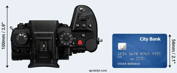 The side-by-side display below illustrates the physical size of the Panasonic GH7 vis-à-vis a credit card. Three consecutive perspectives from the front, the top, and the back are presented. All width, height and depth dimensions are rounded to the nearest millimeter.