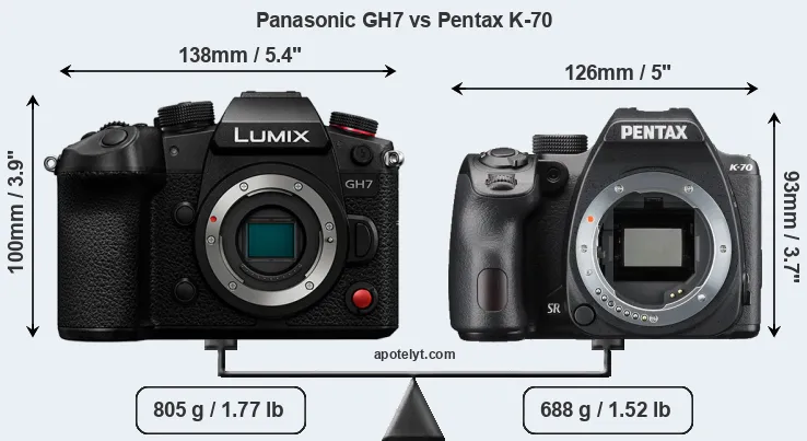 The physical size and weight of the Panasonic GH7 and the Pentax K-70 are illustrated in the side-by-side display below. The two cameras are presented according to their relative size. Three consecutive views from the front, the top, and the rear side are shown. All width, height and depth dimensions are rounded to the nearest millimeter.