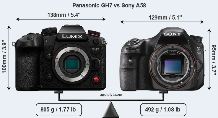 The side-by-side display below illustrates the physical size and weight of the Panasonic GH7 and the Sony A58. The two cameras are presented according to their relative size. Three consecutive perspectives from the front, the top, and the back are available. All width, height and depth measures are rounded to the nearest millimeter.