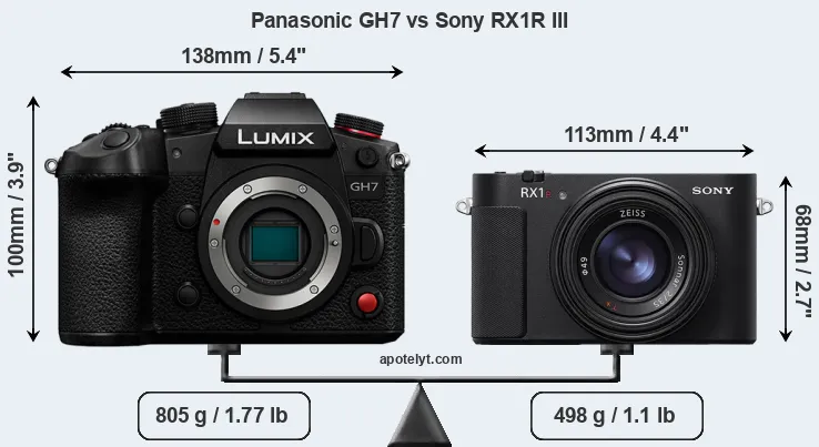 The above size and weight comparisons are to some extent incomplete and possibly misleading, as the RX1R III has a lens built in, whereas the GH7 is an interchangeable lens camera that requires a separate lens. Attaching the latter will add extra weight and bulk to the setup. You can compare the optics available for the GH7 and their specifications in the Micro Four Thirds Lens Catalog.