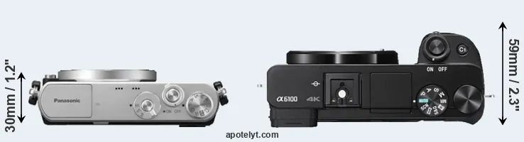 The side-by-side display below illustrates the physical size and weight of the Panasonic GM1 and the Sony A6100. The two cameras are presented according to their relative size. Three consecutive views from the front, the top, and the rear side are shown. All width, height and depth dimensions are rounded to the nearest millimeter.